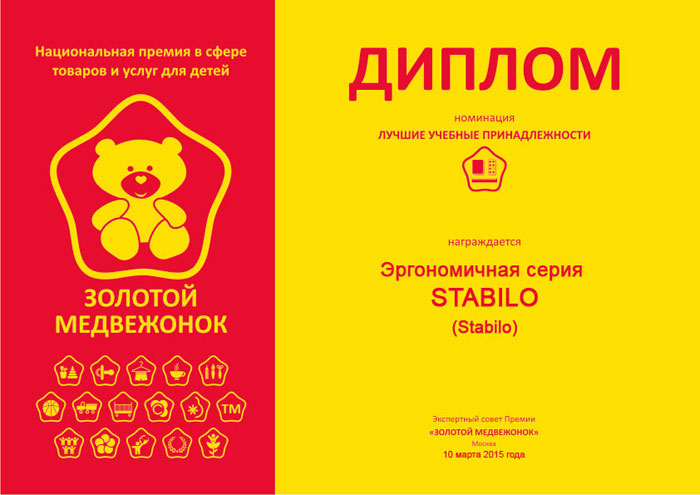 10 марта 2015 года Экспертный Совет Премии удостоил эргономичную серию STABILO, в которую входят STABILO ERGO и STABILO LeftRight, почетного звания «Лучшие учебные пособия и принадлежности для детей». Эта награда не случайна. За 160 лет STABILO пережила немало изменений в письменной культуре и активно помогала формировать их. Именно STABILO первой обратилась к проблемам левшей, которые составляют около 20% населения, выпустив уникальную ручку STABILO`s move easy, имеющую две версии: для левшей и для правшей. Затем STABILO облегчило обучение детей, разработав эргономичную серию для обучения письму дошкольников и младших школьников STABILO LeftRight.